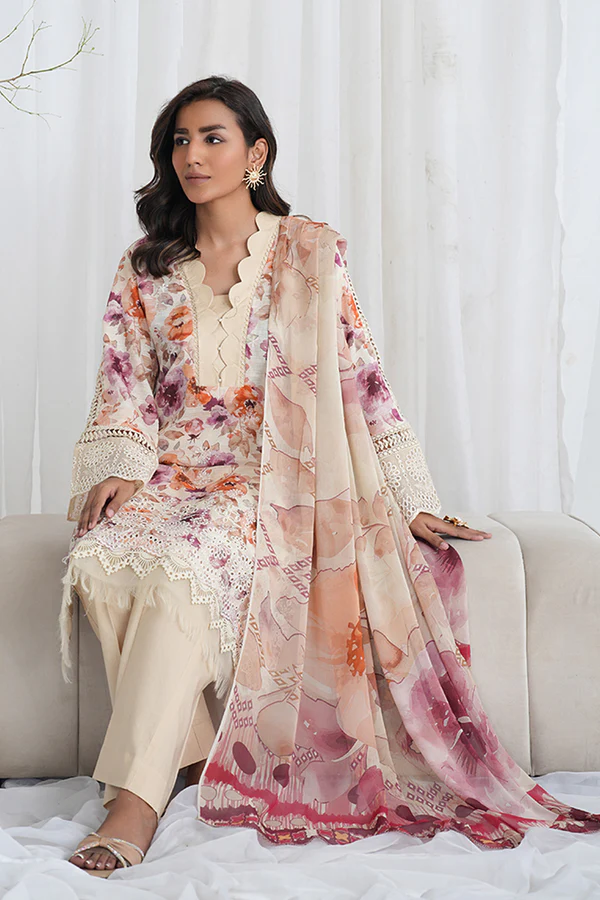 Introducing JH-837-AFR, a beautifully designed Pakistani lawn suit that blends the delicate charm of Chikankari embroidery with the freshness of contemporary prints. This elegant ensemble is curated for those who appreciate traditional artistry and modern-day sophistication — an ideal choice for summer elegance.